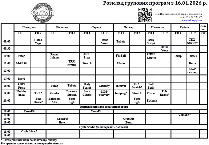 | 18:00 | ABT + Пресс | Pump | Табата | BodySculpt | Мобильность | интервал | TRX-Stretch ® | Полное тело | |||||