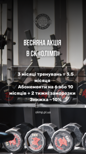 С 16 по 31 березня у СК «Олімп» діють спеціальні умови на абонементи. Це гарна можливість розпочати тренування або продовжити заняття на вигідніших умовах.